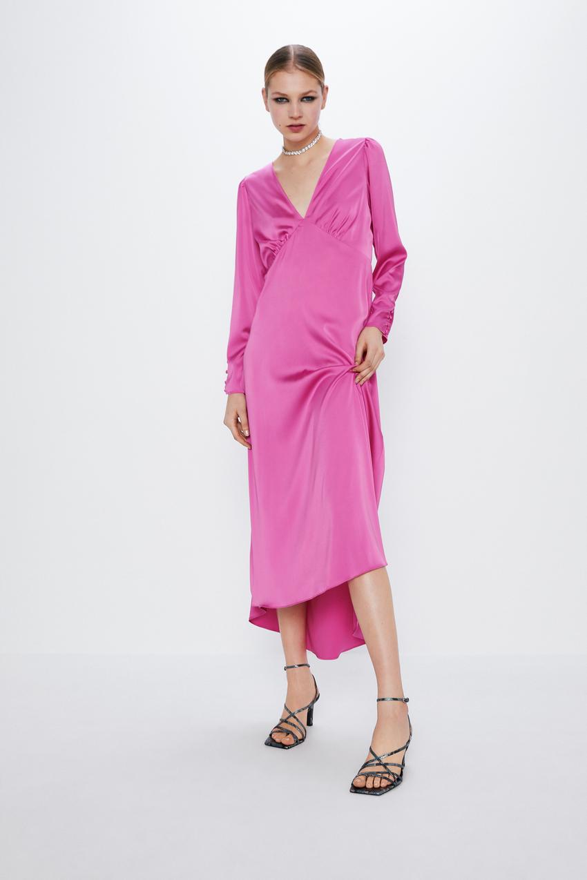 La tela brillosa y lisa está de vuelta en los colores más encendidos. Es una buena idea para una cena elegante. Úsalos con zapatillas y sin medias. Zara tiene un gran catálogo de vestidos en este material para estas celebraciones.