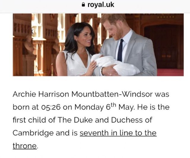 Luego que el bebé real naciera, la madrugada del lunes, el sitio oficial de la realeza, dedicó una entrada para dar a conocer la noticia: "Archie Harrison Mountbatten-Windsor nació a las 05:26 horas del lunes 6 de mayo. Él es el primer hijo del duque y la duquesa de Cambridge y el séptimo en la línea al trono británico", escribieron.
