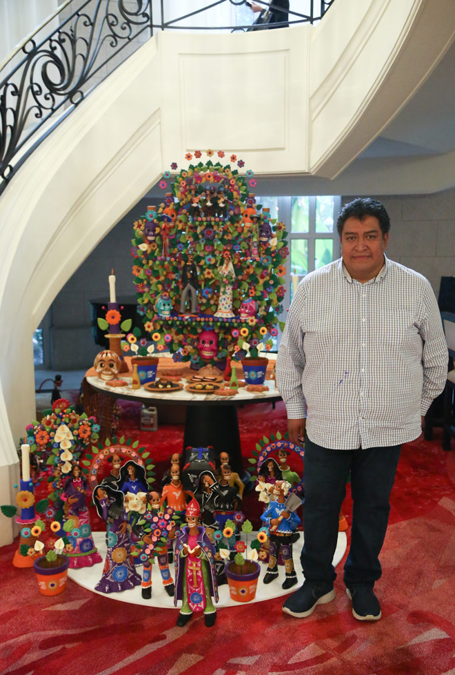Además, justo a un costado de las escaleras principales, se ubica una escultura que representa un árbol de la vida, el cual incluye una boda tradicional mexicana con frutas, flores, comida y las características calaveras de Día de Muertos. Esta pieza fue creada por el artesano Óscar Soteno, un artista cuya familia se ha dedicado durante tres generaciones a promover la belleza de las artesanías nacionales.