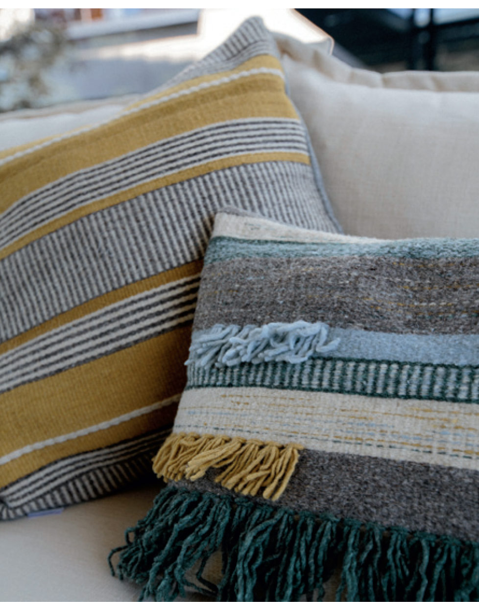 La inspiración en las formas geométricas simples llevó a Arudeko a colaborar con artesanos mexicanos para lanzar la colección Granada. Cada pieza es tejida en telar de pedal con lana nacional utilizando semillas y plantas para obtener los colores. Su tono mostaza y acentos azules crean una composición ideal para cualquier espacio.