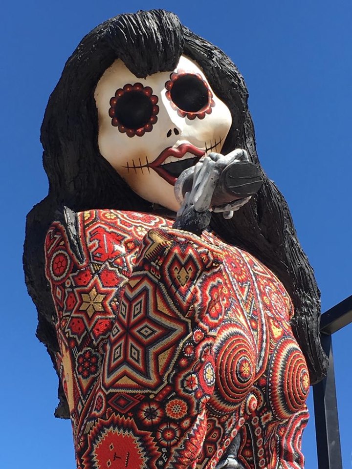 La catrina mide 10 pies de altura (tres metros) y fue adornada con dos millones de chaquiras de cristal y hecha a mano por 40 artesanos indígenas huicholes que trabajaron dos meses a diario para que estuviera lista para las celebraciones de Día de Muertos.