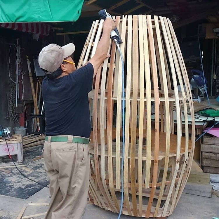 El medio estadunidense My Modern Met recogió el trabajo a mano de esta pareja y su gran habilidad en la carpintería y su impecable atención a los detalles para construir una figura de Totoro. A partir de algunas técnicas tradicionales de enlucido, construyeron primero el armazón en forma de barril para darle forma a la futura estatua.