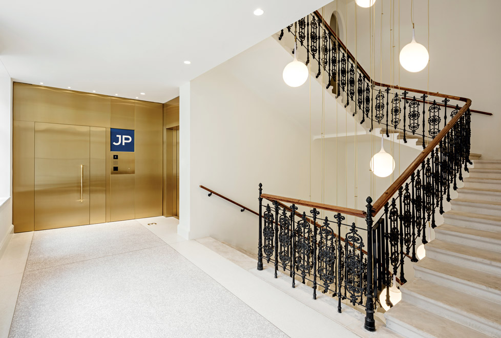 El diseño minimalista y elegante es un motivo recurrente a través de los diferentes ámbitos del proyecto. Por ejemplo, el muro del elevador que lleva a las oficinas está recubierto de latón, mientras que para el piso se instaló un acabado de terrazzo.