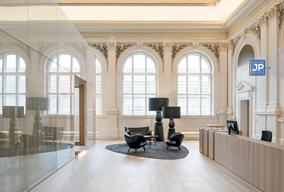 En la propuesta arquitectónica, dos de las salas del edificio se convirtieron en el corazón del proyecto. El reto fue conectar ambas salas por medio de un espacio que albergara al nuevo corporativo de la agencia de bienes raíces JP Immobilien.