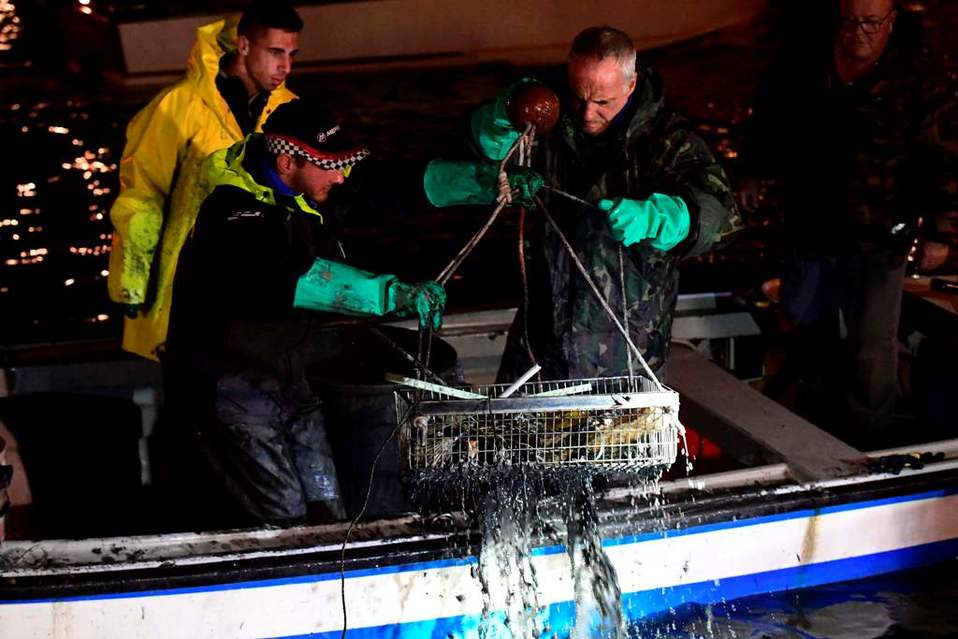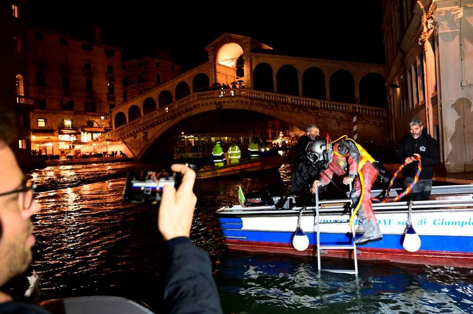 Abandonando el tradicional traje de rayas por el impermeable que usan los buzos para protegerse de las aguas contaminadas de la laguna de Venecia, media docena de gondoleros se turnaron desde las 18:00 horas hasta la medianoche para sacar basura cerca del famoso puente de Rialto.