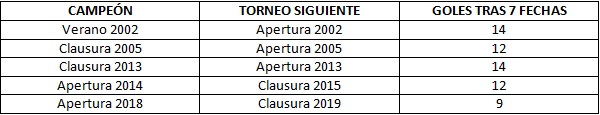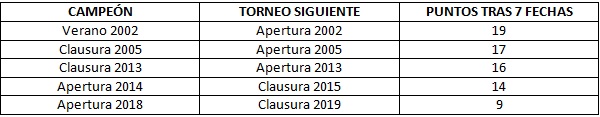 Con estos números, al finalizar las primeras siete jornadas del campeonato, los cremas ya pueden decir que completan su peor arranque de torneo luego de ser campeones, esto en lo que se refiere a los títulos que el América han conseguido en la historia de los torneos cortos.