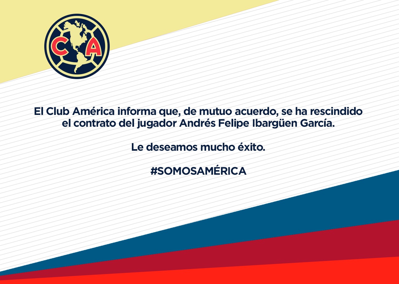 “El Club América informa que, de mutuo acuerdo, se ha rescindido el contrato del jugador Andrés Felipe Ibargüen García. Le deseamos mucho éxito”, se lee en el breve comunicado del conjunto capitalino.