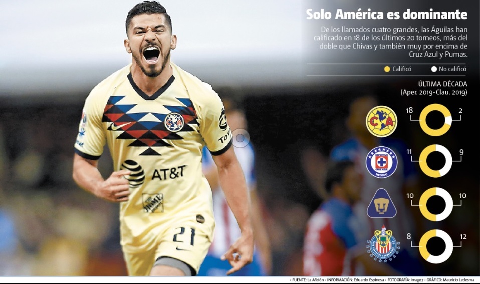 En la última década, América es el único equipo, de los llamados cuatro grandes, que puede presumir que siempre -o casi siempre- está en la pelea por el título de Liga. De 2009 a la fecha, Las Águilas han estado en un 90 por ciento de ocasiones en la fiesta grande (18 de 20 torneos), mientras que Cruz Azul registra el 55, Pumas con apuros alcanza el 50, y Chivas es el peor un 40 por ciento.