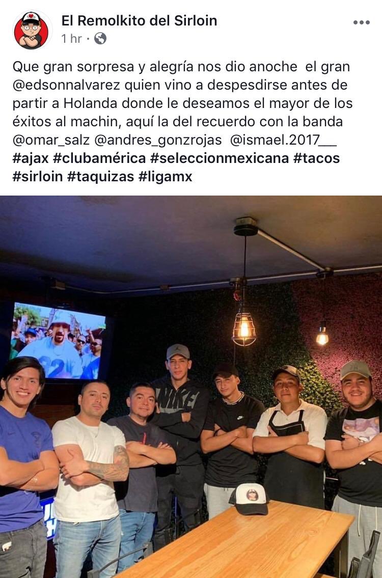 “Qué gran sorpresa y alegría nos dio anoche el gran Edson Álvarez, quien vino a despedirse antes de partir a Holanda”, fue el mensaje compartido por El Remolkito del Sirloin, un comercio de tacos ubicado en la capital del país, junto a una foto donde aparece el todavía futbolista de las Águilas.