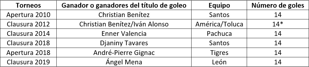 Lo anterior se debe a que desde el Bicentenario 2010 (torneo que siguió al Apertura 2009), 14 es el número máximo de tantos con los que se ha entregado el título de Capocannoniere. Desde entonces, esta cantidad fue alcanzada por seis jugadores en siete ocasiones.