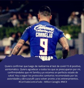 "Quiero informar que luego de realizarme el test de covid-19 di positivo asintomático. Quiero agradecer a todos los que se preocupan por mi, confirmándoles que mi familia y yo estamos en perfecto estado de salud. Voy a seguir los protocolos sanitarios recomendado por las autoridades y Cruz Azul para volver pronto a los entrenamientos", escribió Caraglio.