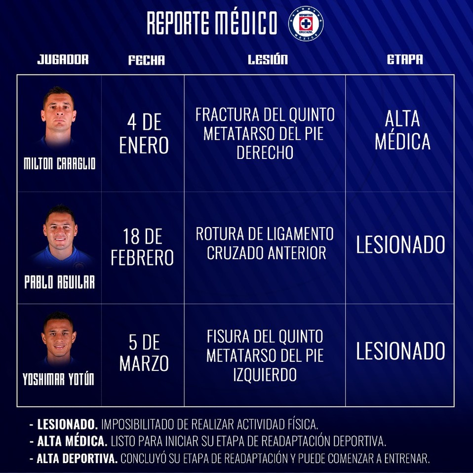 Quienes aún tienen la etiqueta de lesionados son el paraguayo Pablo Aguilar, con una rotura del ligamento cruzado anterior y que se perderá todo el Clausura 2020, y el peruano Yoshimar Yotún, con una fisura del quinto metatarso del pie izquierdo.