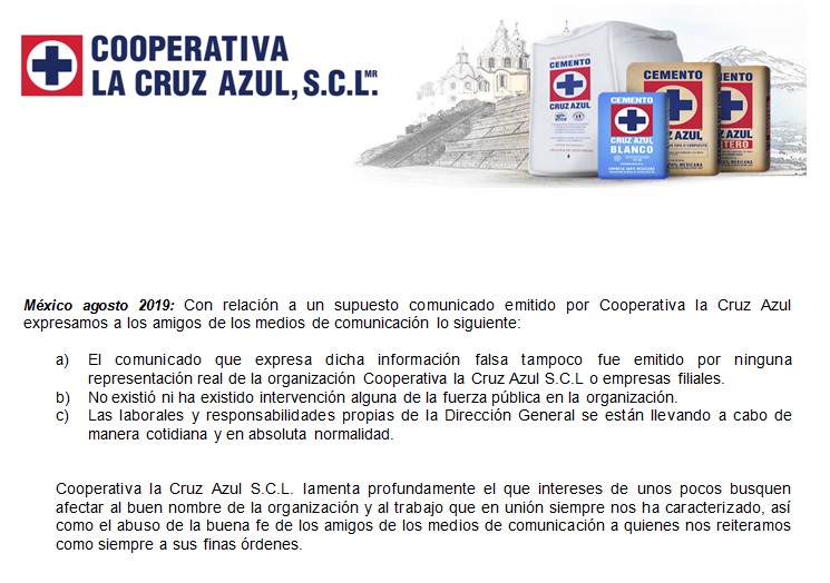 Hoy por la mañana el grupo de cooperativistas denominado Cooperativa La Cruz Azul, S. C. L informó a través de un comunicado que de acuerdo con el cumplimiento de una orden del Juez XI de Distrito, en materia civil de la Ciudad de México, se había destituido a Guillermo Álvarez Cuevas como director general de la Cooperativa; sin embargo, esto es falso.