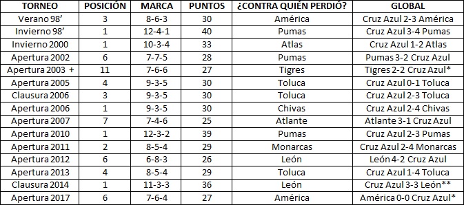 La primera liguilla que Cruz Azul disputó en torneos cortos fue la del Invierno 97’, misma en donde levantó su octavo título de liga. Tras ello, La Máquina acumula cinco Finales perdidas y 21 eliminaciones; seis de ellas en Semifinales, mientras que las 15 restantes han ocurrido en la etapa de Cuartos de Final, marca que constituye un récord de la liga.
