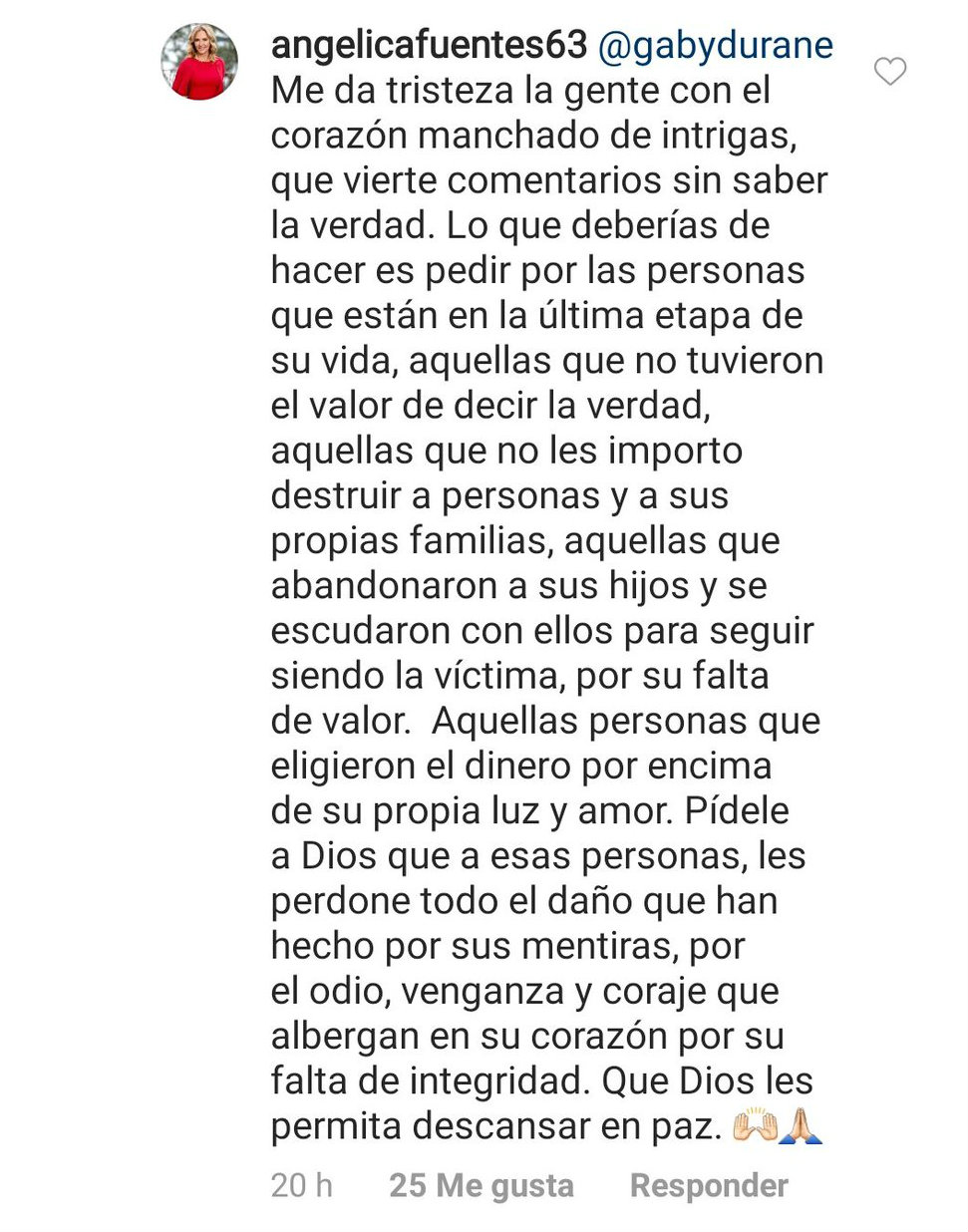 Tras este comentario, Angélica Fuentes respondió: "Me da tristeza la gente con el corazón manchado de intrigas, que vierte comentarios sin saber la verdad", además de decirle a la usuaria que mejor debería "pedir por las personas que están en la última etapa de su vida", mensaje en el que estaría haciendo referencia a su ex esposo.