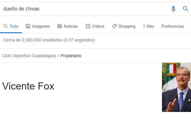 Y es que el ex mandatario fue colocado como nuevo propietario de las Chivas por Google, esto luego de que en su buscador de hiciera la siguiente pregunta: ¿Quién es el dueño de Chivas?