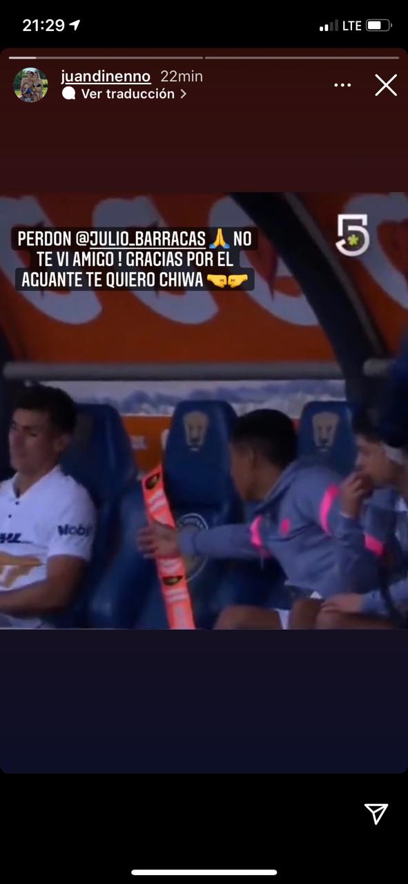 Sin embargo, más tarde el delantero argentino aprovechó sus redes sociales para aclarar que no vio cuando su juvenil compañero le ofreció la mano. "Perdón, Julio Barragán. No te vi, amigo. Gracias por el aguante. Te quiero Chiwa", escribió el jugador felino.