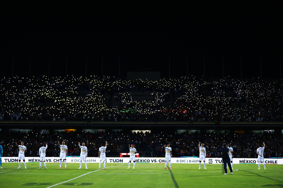 Previo al partido de semifinal de ida de la Liga MX ante Atlas, la afición de los felinos mandó un mensaje de apoyo con un detalle para sus jugadores, pues formaron un espectacular mosaico de luces en las tribunas del estadio Olímpico Universitario en el que se ve el escudo del club