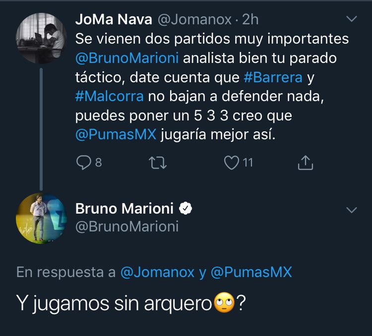 El simpatizante de Pumas escribió lo siguiente: "Se vienen dos partidos muy importantes. Bruno Marioni, analiza bien tu parado táctico, date cuenta que Barrera y Malcorra no bajan a defender nada. Puedes poner un 5-3-3".
