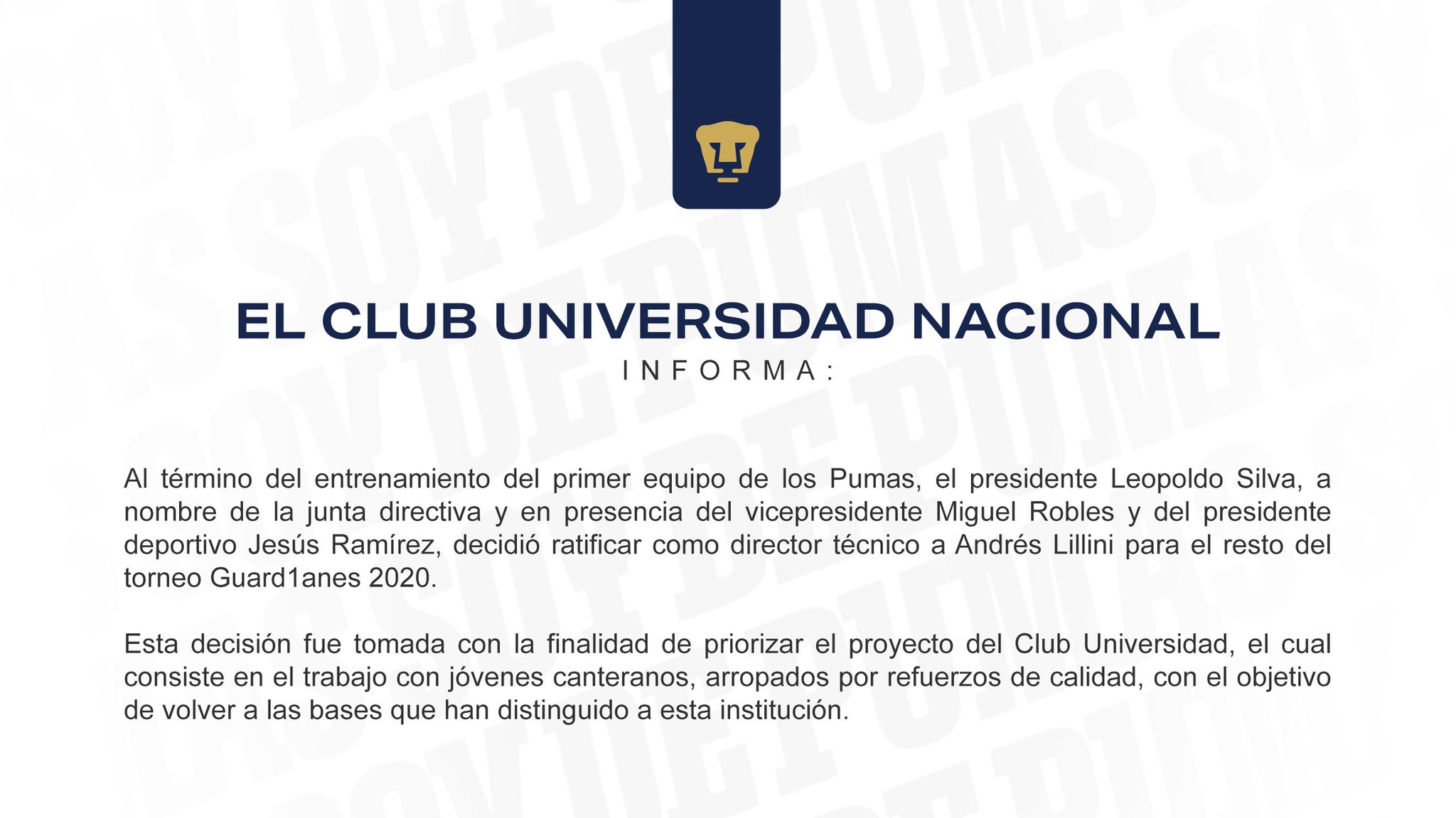 Se terminó la búsqueda de director técnico en Pumas. El club Universidad informó que Andrés Lillini se mantendrá en el puesto lo que resta del Guard1anes 2020.