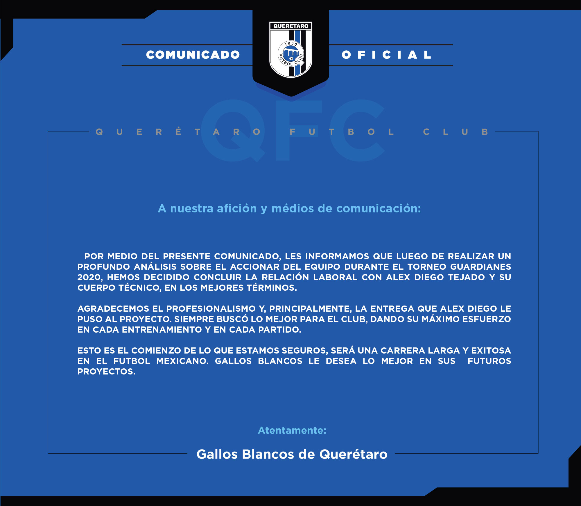 “Luego de realizar un profundo análisis sobre el accionar del equipo durante el torneo Guard1anes 2020, hemos decidido concluir la relación laboral con Alex Diego y su cuerpo técnico”, expuso el equipo en un comunicado oficial.