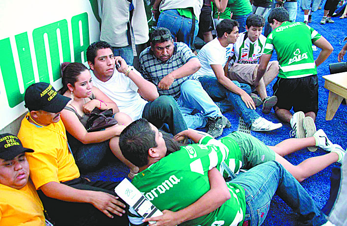 De pronto la gente de las tribunas bajas comienza a saltar a la cancha, algunos se resguardan detrás de las estructuras de los anuncios, hay gente llorando, algunas mujeres entran en pánico y no saben a dónde correr o qué hacer.