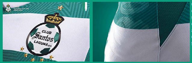 La tradicional playera de franjas color verde y blanco, el verde muestra franjas en dos tonalidades que forman una estrella cerca de escudo, el cual se ubica a la izquierda rodeado de las seis estrellas, cinco en la parte de abajo y una arriba.