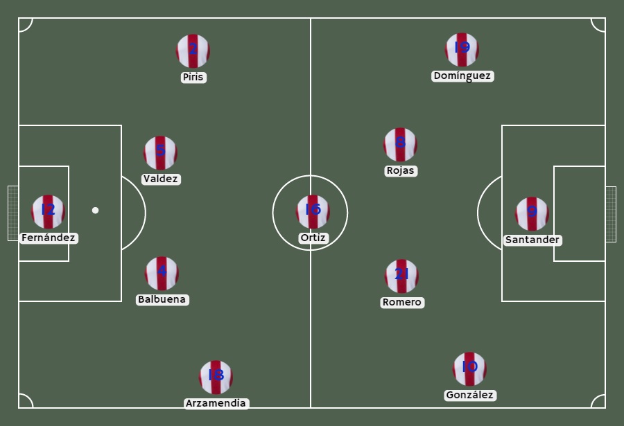 Fernández; Arzamendia, Valdez, Balbuena, Piris; Ortiz, Almirón, Rojas; Domínguez, Santander, González. DT. Eduardo Berizzo.