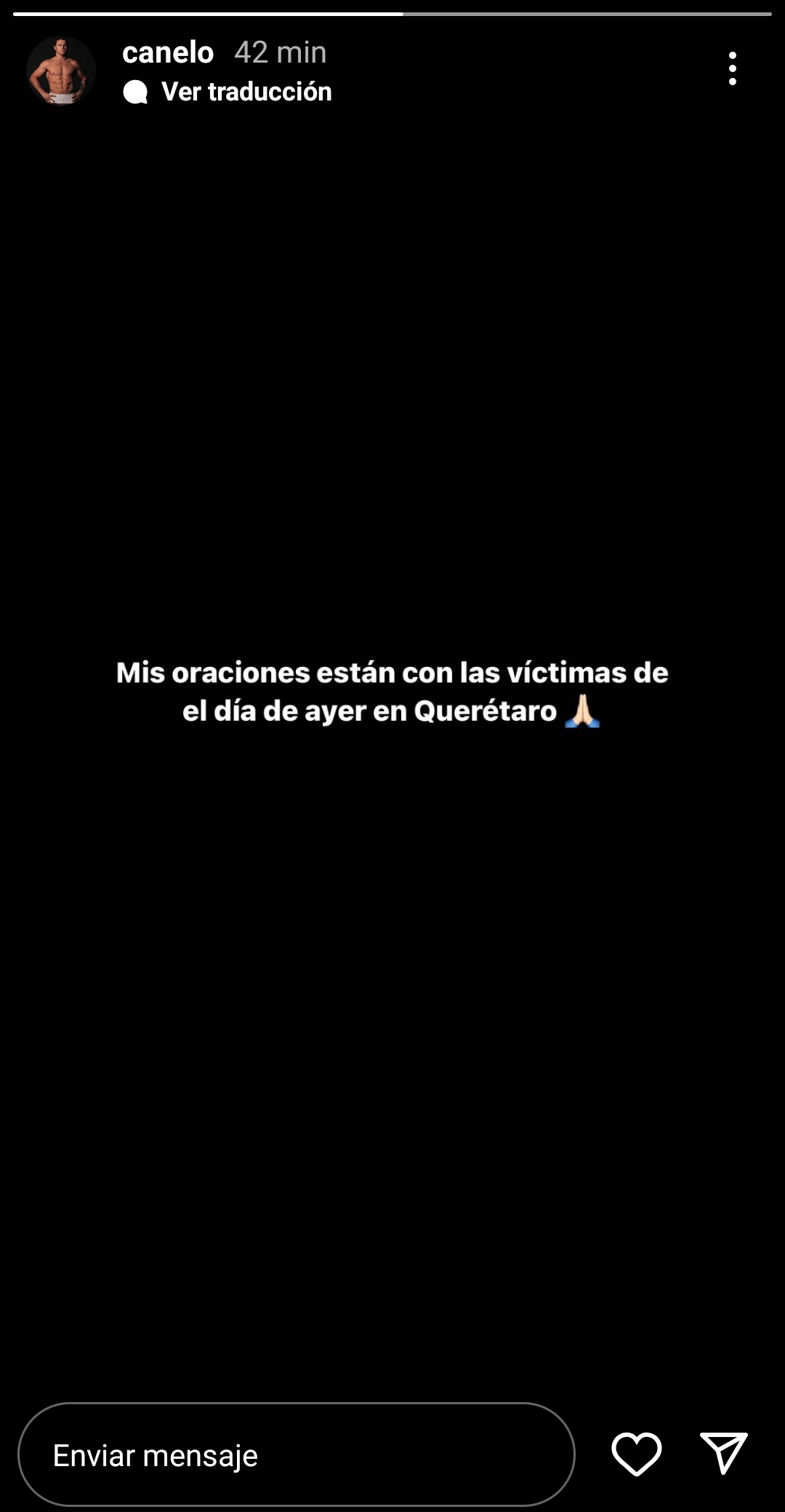 Uno de los deportistas que se manifestó tras lo ocurrido fue el boxeador Saúl Canelo Álvarez, mismo que compartió una historia en Instagram solidarizándose con las víctimas de este este incidente en Querétaro.