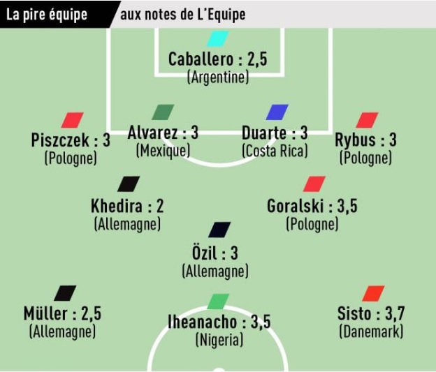 Tras haberse dado a conocer el XI ideal del Mundial de Rusia 2018, el diario L'Equipe, de Francia, se dio a la tarea de armar una alineación con los once jugadores que, a su consideración, fueron los peores en esta Copa del Mundo.