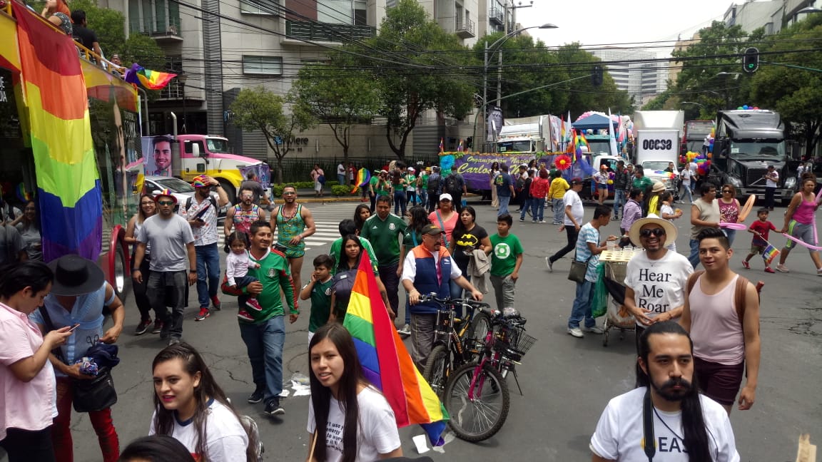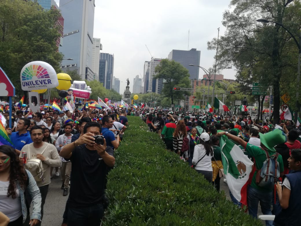 Aficionados que van hacia el Ángel de la Independencia y participantes de la Marcha del Orgullo Gay que van hacia el Zócalo, se cruzaron en Reforma.
