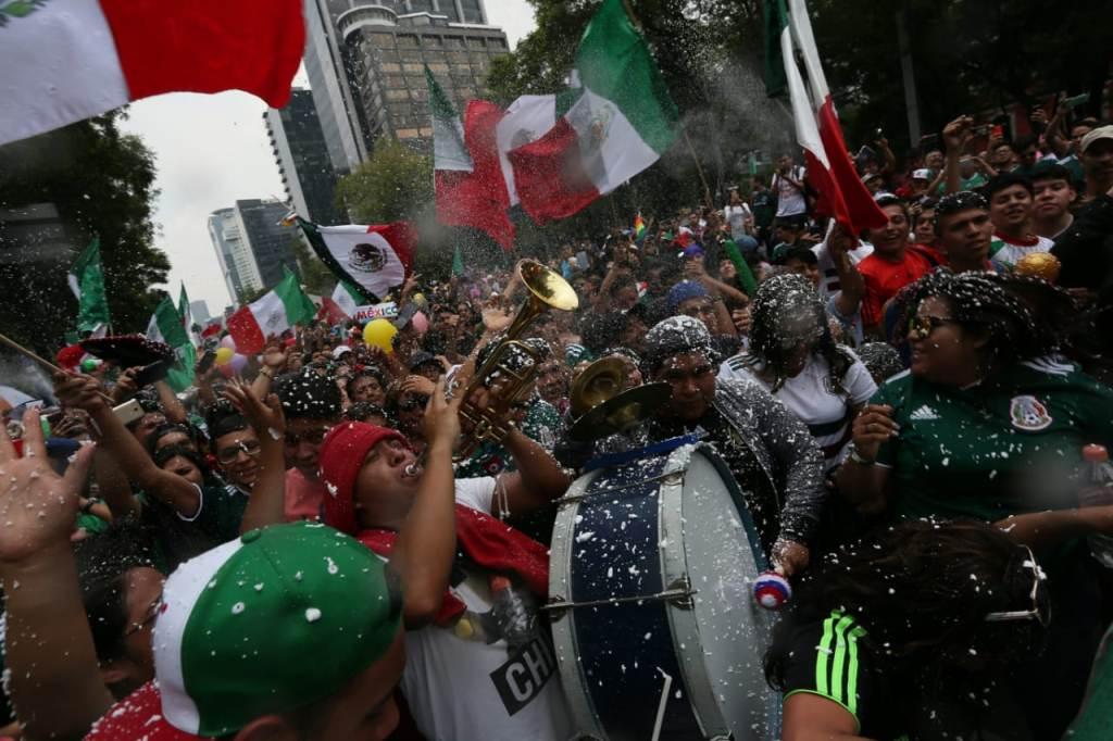 Con banderas, máscaras , sombreros de mariachi, mucha espuma y hasta un dron,los aficionados organizaron una fiesta en el Ángel de la Independencia.