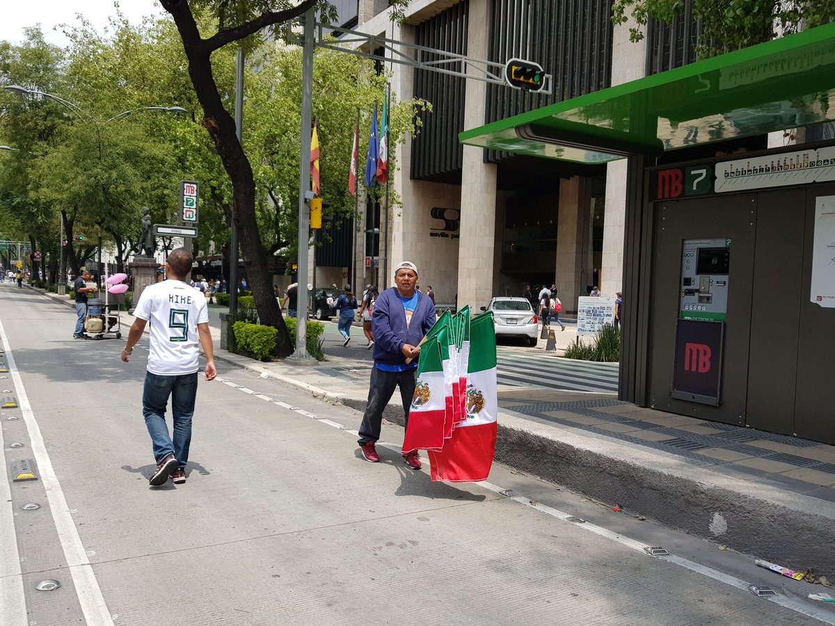 Además de aficionados y participantes de la manifestación, los vendedores acuden al Ángel de la Independencia para vender banderas playeras de la selección mexicana.