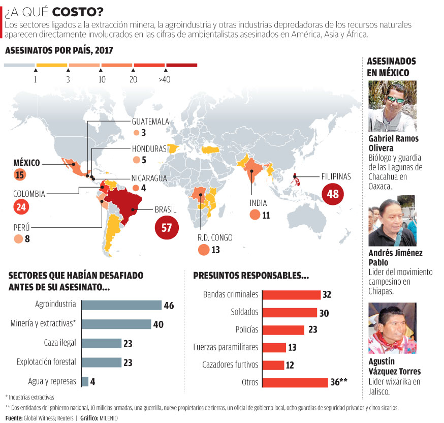 Según destaca Rémi Barroux, del diario francés Le Monde, “las víctimas son desde jefes comunitarios hasta activistas, asesinados mientras intentaban proteger sus casas y sus comunidades contra la extracción minera, la agroindustria y otras industrias destructivas”, como detalla Global Witness.