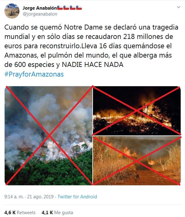 Una de las publicaciones que ha generado más viralidad con el hashtag #PrayForAmazonas contiene tres imágenes. Ninguna corresponde a los incendios de este año.