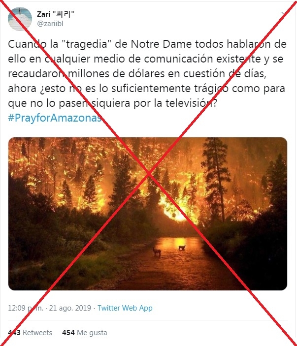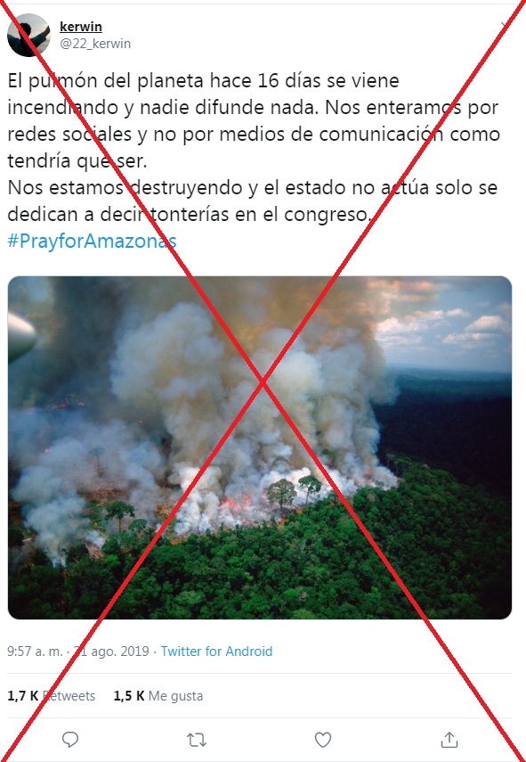 A raíz de los incendios que afectan la selva amazónica, muchas imágenes se viralizaron como si mostraran los efectos de decenas de estos focos. La etiqueta #PrayForAmazonas fue tendencia en redes, usada para denunciar esta emergencia ambiental, pero en su mayoría apoyándose en imágenes antiguas o incluso tomadas muy lejos de Brasil.