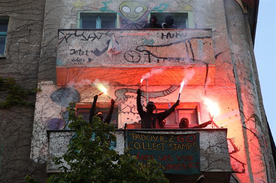 En la otra vereda, varios manifestantes de izquierda prendieron bengalas en los balcones de un edificio durante una manifestación en Berlín.