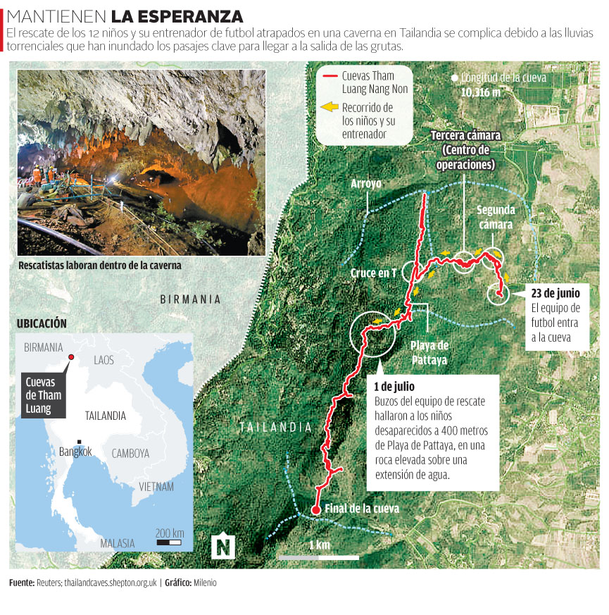 La ausencia ayer de lluvias abrió la esperanza de una pronta operación de rescate dentro de la cueva situada en el parque natural Tham Luang-Khun Nam Nang Non, en la norteña provincia de Chiang Mai. Además, el incesante trabajo de unas 20 bombas de extracción de agua drenan unos diez mil litros por hora de los pasadizos inundados.