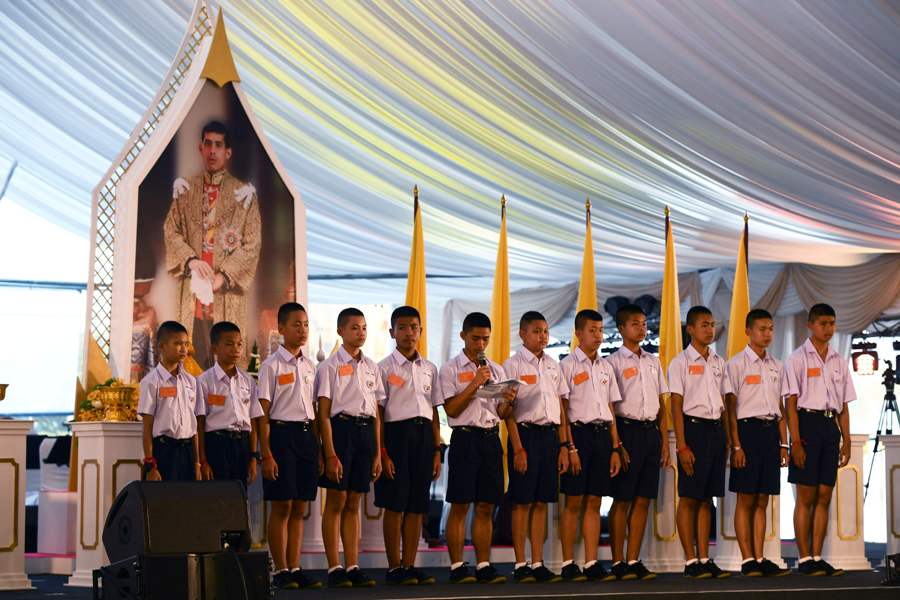 Los rescatados, integrantes del equipo de fútbol juvenil "Jabalíes salvajes" y protagonistas del mediático salvamento, acudieron como invitados de honor a la gala auspiciada en la Plaza Real Dusit, en el casco histórico de Bangkok.