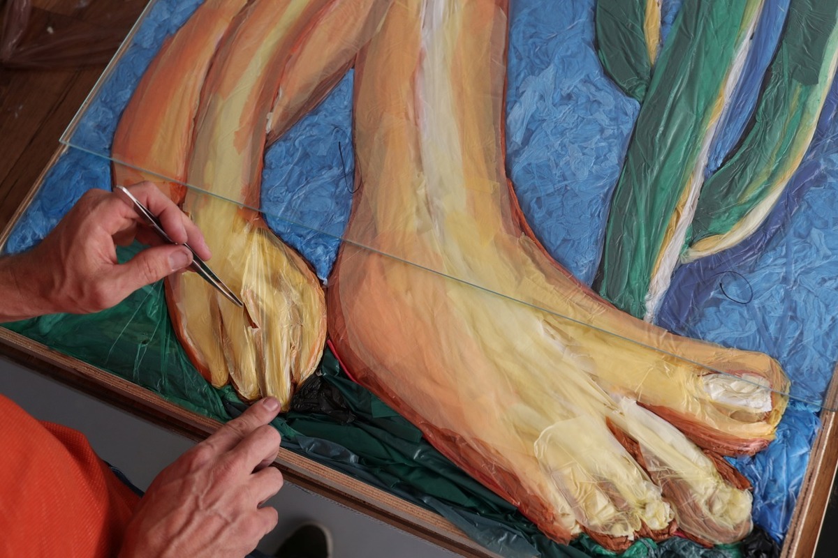 “El plástico domina todo y a todos hoy en día, por eso en esta serie creo obras de arte que no tienen pintura ni pegamento, solo trozos de bolsas de plástico que terminan haciendo la imagen que ves”, dijo.