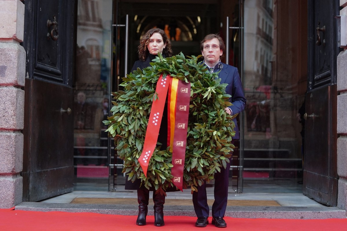 La presidenta, Isabel Díaz Ayuso, y el alcalde de la ciudad, José Luis Martínez-Almeida, colocaron juntos una corona de laurel frente a la placa conmemorativa instalada a la derecha de la puerta principal del edificio.