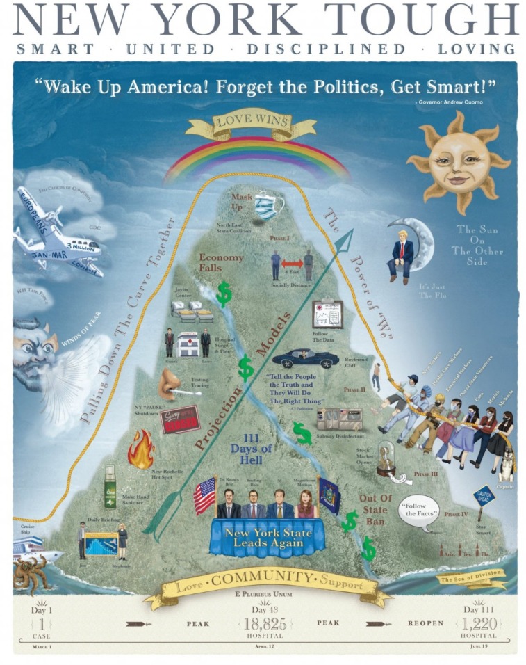 Convertido en ejemplo nacional por la forma en cómo enfrentó el covid-19, el gobernador de Nueva York, Andrew Cuomo, presentó un poster que resume más de 3 meses de conferencias de prensa diarias, en las que el funcionario construyó frases, describió momentos y lanzó propuestas que se quedaron como parte de la memoria en la lucha contra la pandemia.