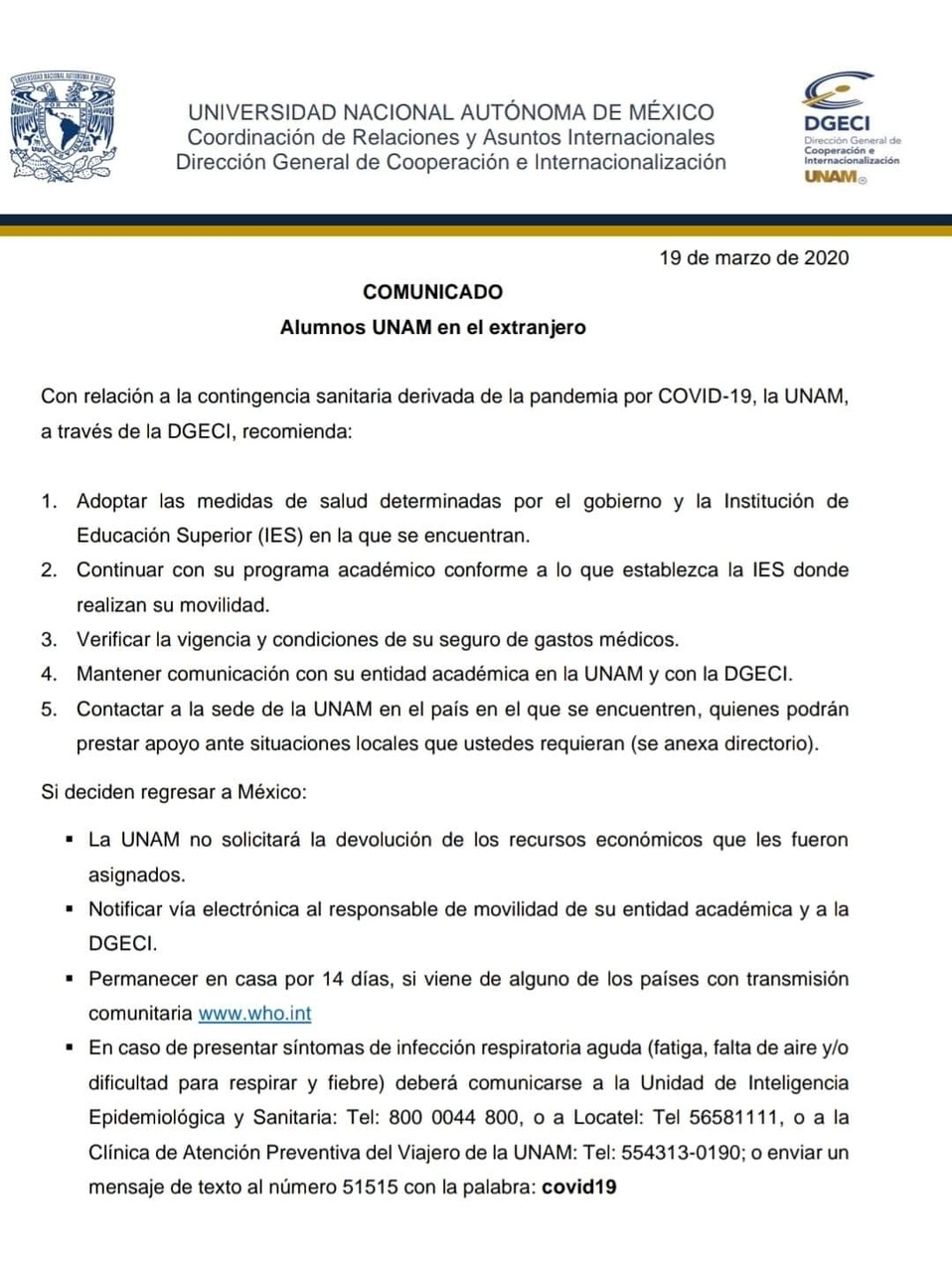 UNAM pide seguir recomendaciones del país