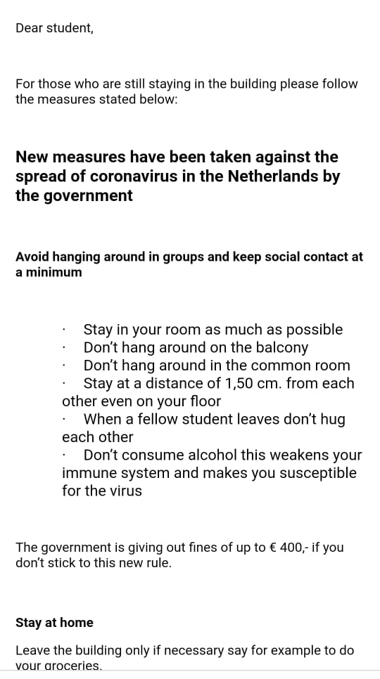 El 12 de marzo, el gobierno de Países Bajos anunció que iban a poner restricciones en primarias, secundarias, universidades y en varias partes como museos, cines, entre otros. A Mary Paz le pospusieron sus clases hasta el 10 de abril.