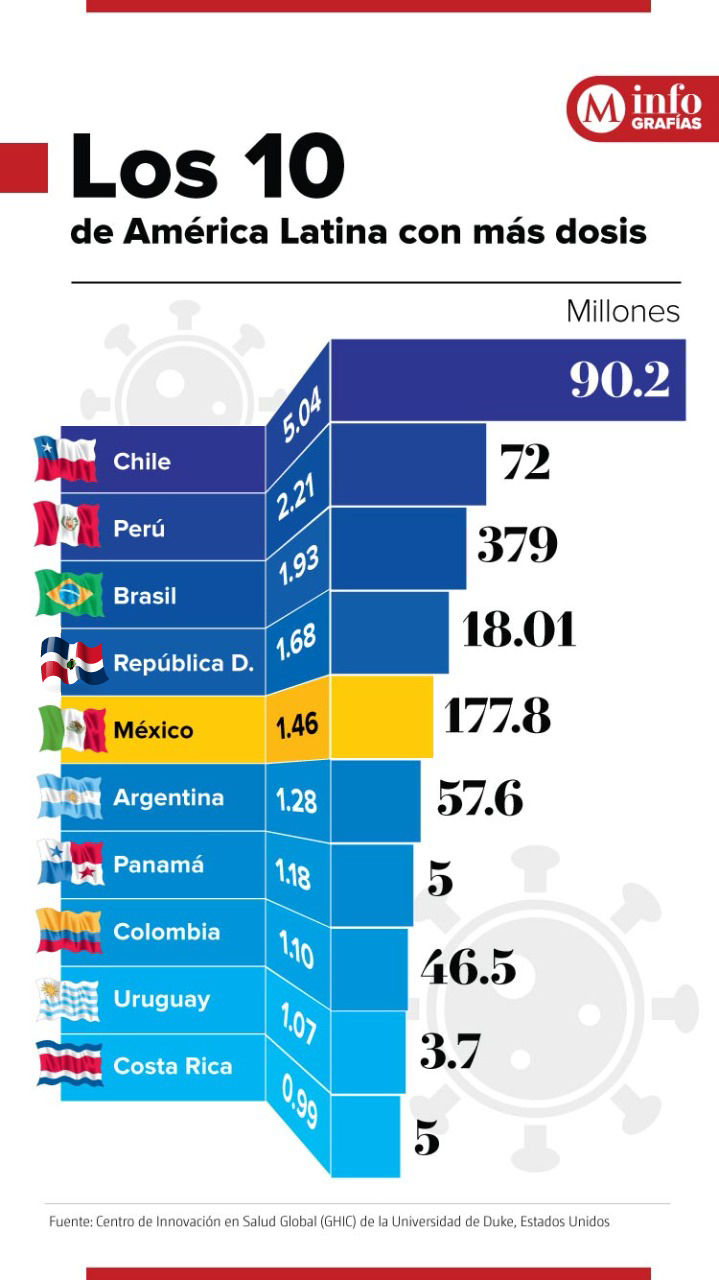 A excepción de Chile y Perú, ningún país latinoamericano supera las dos dosis por habitante, esto aún contando con la iniciativa Covax. Sin embargo, hay naciones latinoamericanas que no alcanzan ni una sola dosis por habitante.