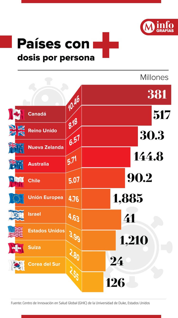 Es decir, Canadá tiene dosis adquiridas para vacunar hasta por cinco veces al 100 por ciento su población con esquemas completos de dos dosis, mientras que Reino Unido lo tiene para cuatro veces. Estados Unidos y la Unión Europea tienen para vacunar dos veces a su población.