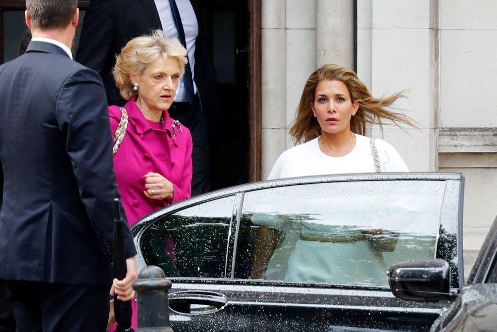 La princesa Haya llegó al tribunal acompañada de su abogada Fiona Shackleton, que representó al príncipe Carlos, heredero de la corona británica, durante su divorcio con la princesa Diana.