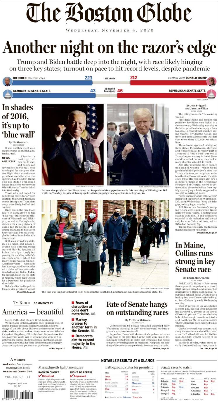 Medios estadunidenses calificaron la elección presidencial como "tensa", de "suspenso" y en una "nación dividida", pues el conteo de votos continúa en estados clave como Pensilvania, Michigan, Georgia o Carolina del Norte.