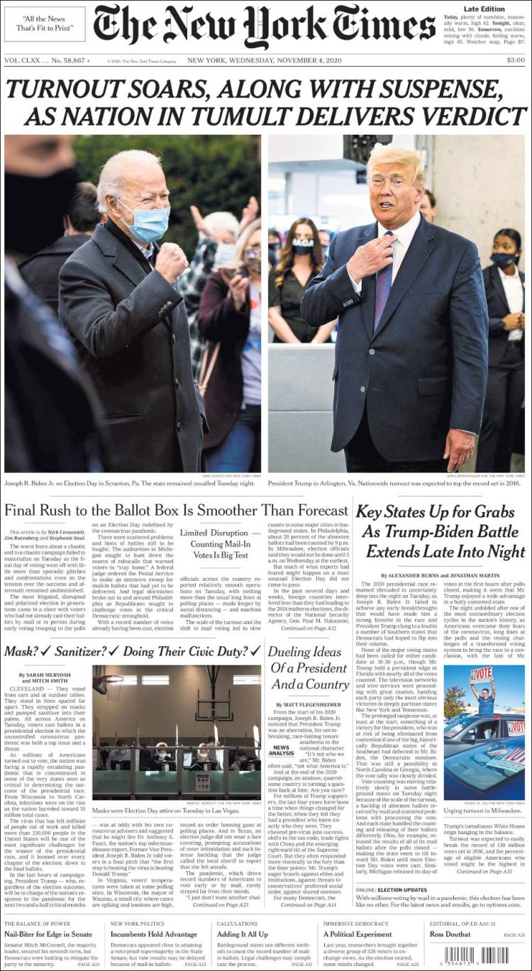 The New York Times - "La participación aumenta, junto con el suspenso, mientras una nación en tumulto entrega veredicto".