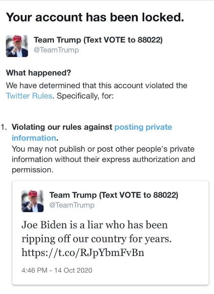 Twitter suspendió la cuenta oficial de la campaña de reelección de Donald Trump por difundir un video contra Joe Biden, su contendiente en las elecciones presidenciales, el cual contenía información contra el democrata por parte del diario New York Post, la cual fue cuestionada por otros profesionales de los medios de comunicación.